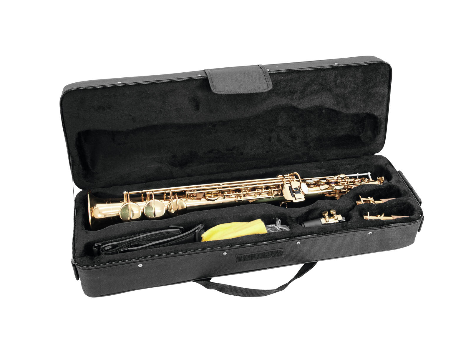 1 x case, 1 x instrument, 1 x mouth piece, 1 x gloves, 1 x microfiber cloth, 3 x strap, 1 x lubricant, 1 x cleaning brush
