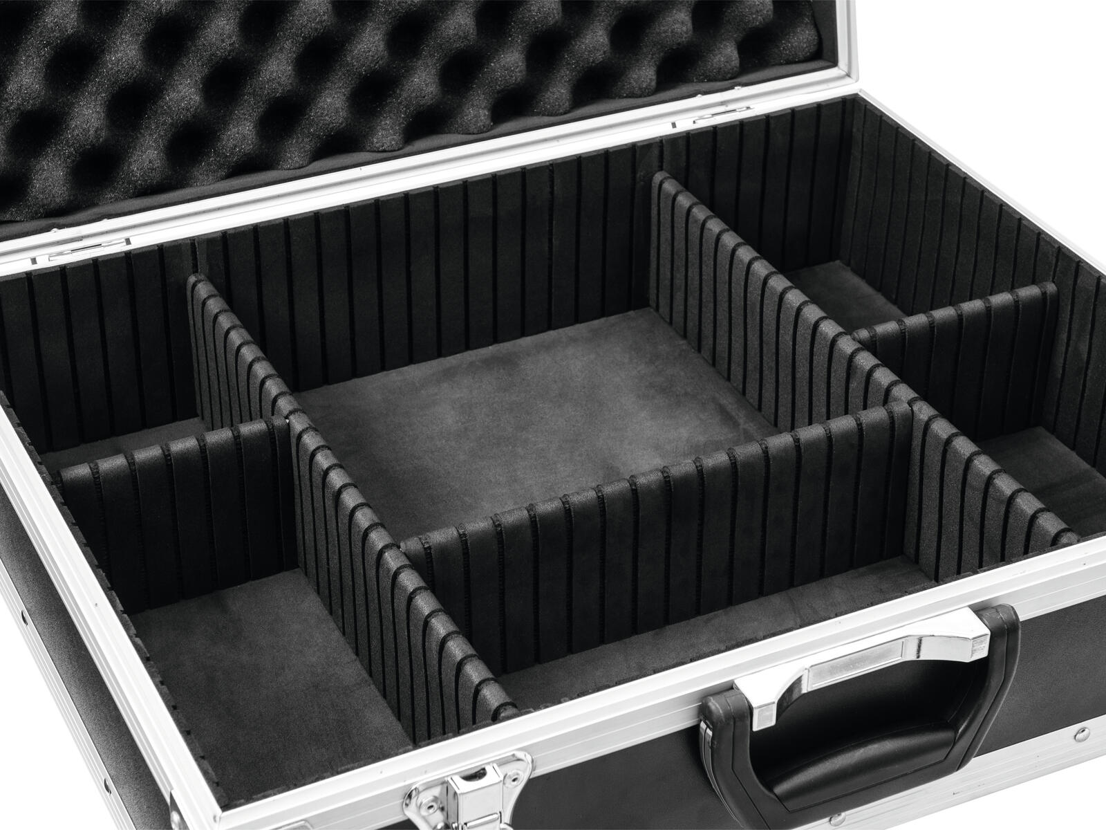 All-purpose flight case with cube foamThe ROADINGER universal case pick is equipped with high-strength foam padding and cube foam. This allows you to adapt your case to your equipment individually. The inner part can therefore be divided without cutting or further processing. The high-quality workmanship with multi-layer glued wood, aluminium profile frame with rounded corners and three-legged, medium-sized steel ball corners give the case stability.The flight case also has two lockable snap locks and a robust carrying handle.