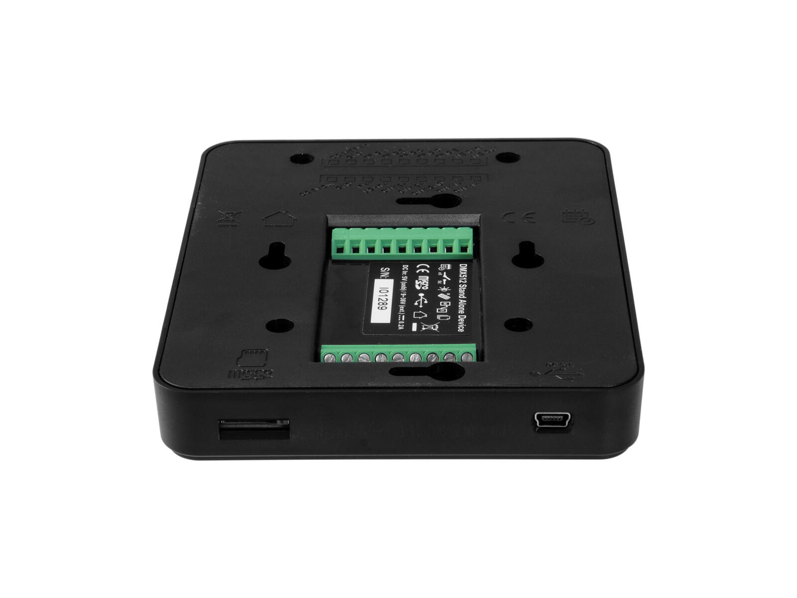 - Flat, wall-mounted stand-alone player for DMX control of light effects without the need for a computer