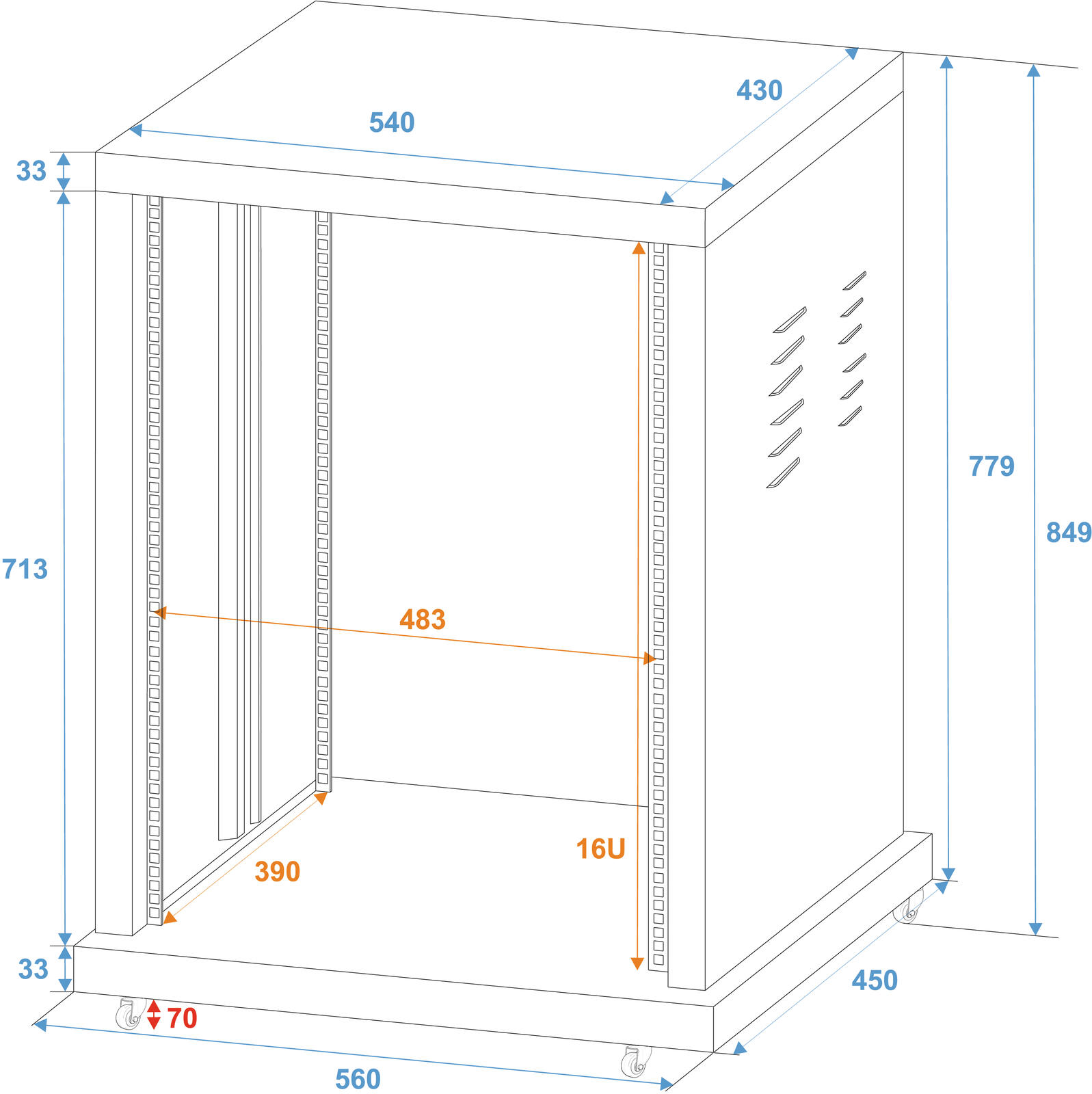 Powder-coated steel rack, ideal for permanent installationsThe powder-coated steel rack by ROADINGER is ideally suited for your permanent installations. It is equipped with punched rack rails at the front and rear and four swivel castors.The integrated support rail in the side panels is designed for heavy equipment such as power amplifiers. The installation depth is 41 cm and the housing design has a height of 16 U.The maximum load is 100 kg.