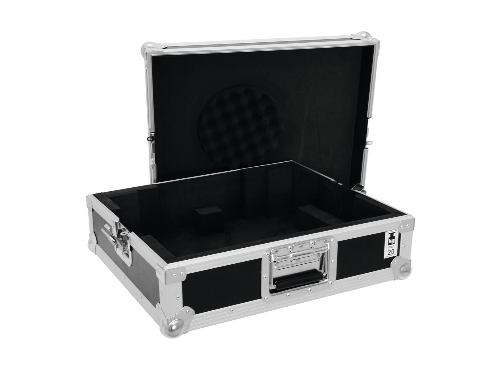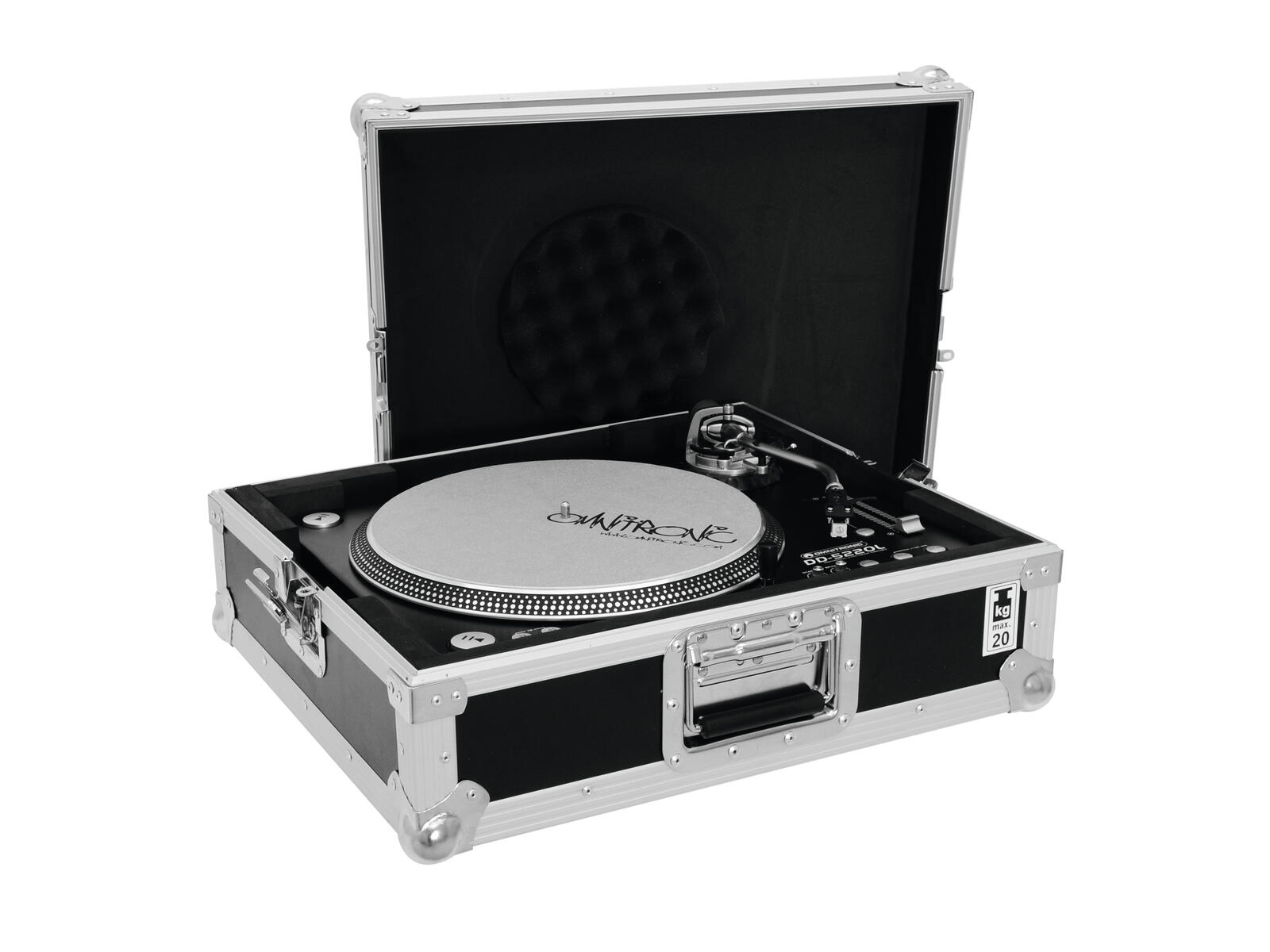 Flightcase for one turntable (up to 450 mm width)The foam padded Roadinger Flightcase offers you space for a turntable without cover up to a width of 450 mm.The high-quality finish with multi-layered glued wood and four steel-reinforced rubber feet provide for the stability of the Roadinger turntable case. In addition, the flight case has two lockable butterfly locks - so your turntable is always safely stored.The maximum load capacity is 20 kg.