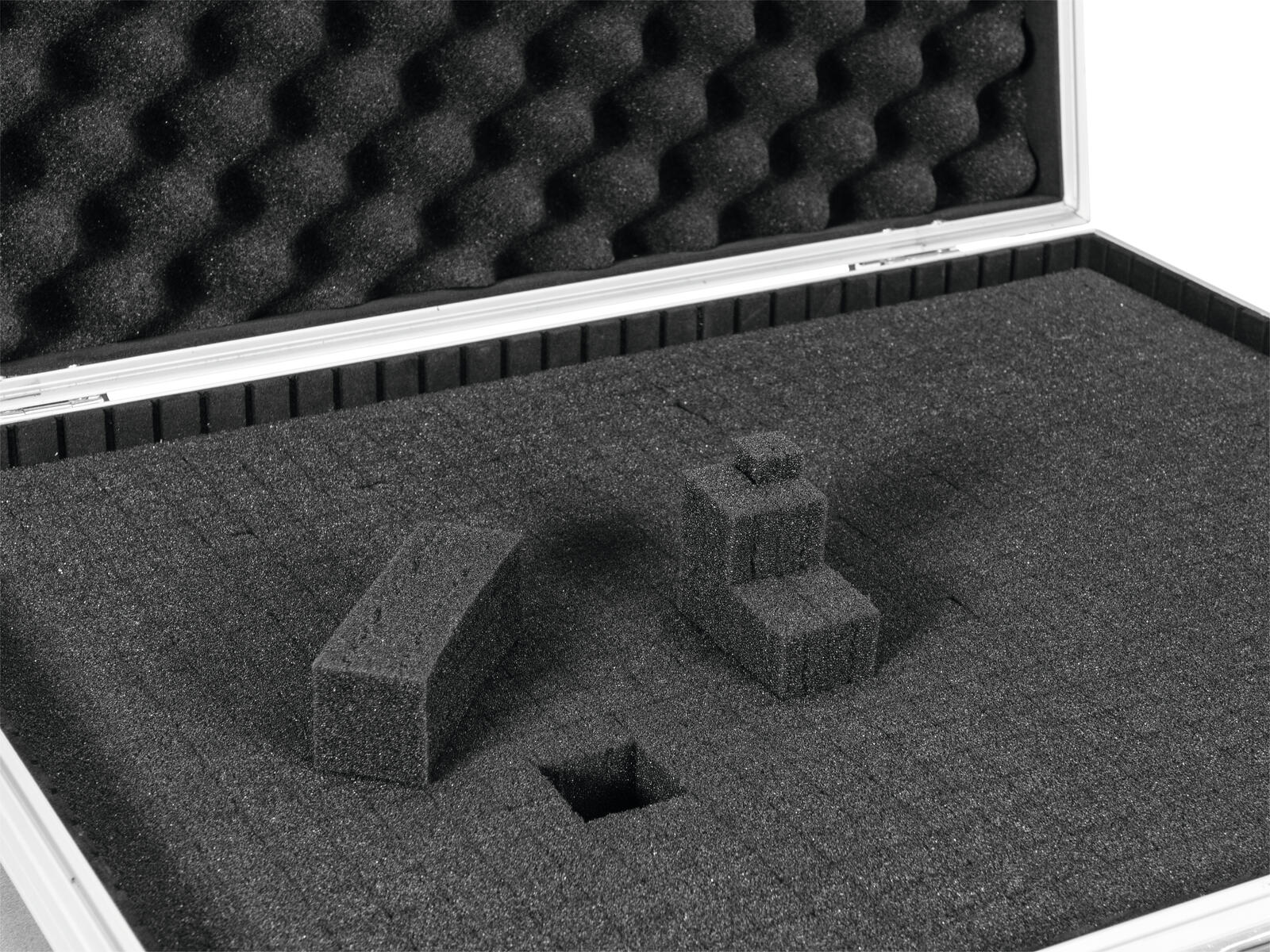 All-purpose flight case with cube foamThe ROADINGER universal case pick is equipped with high-strength foam padding and cube foam. This allows you to adapt your case to your equipment individually. The inner part can therefore be divided without cutting or further processing. The high-quality workmanship with multi-layer glued wood, aluminium profile frame with rounded corners and three-legged, medium-sized steel ball corners give the case stability.The flight case also has two lockable snap locks and a robust carrying handle.
