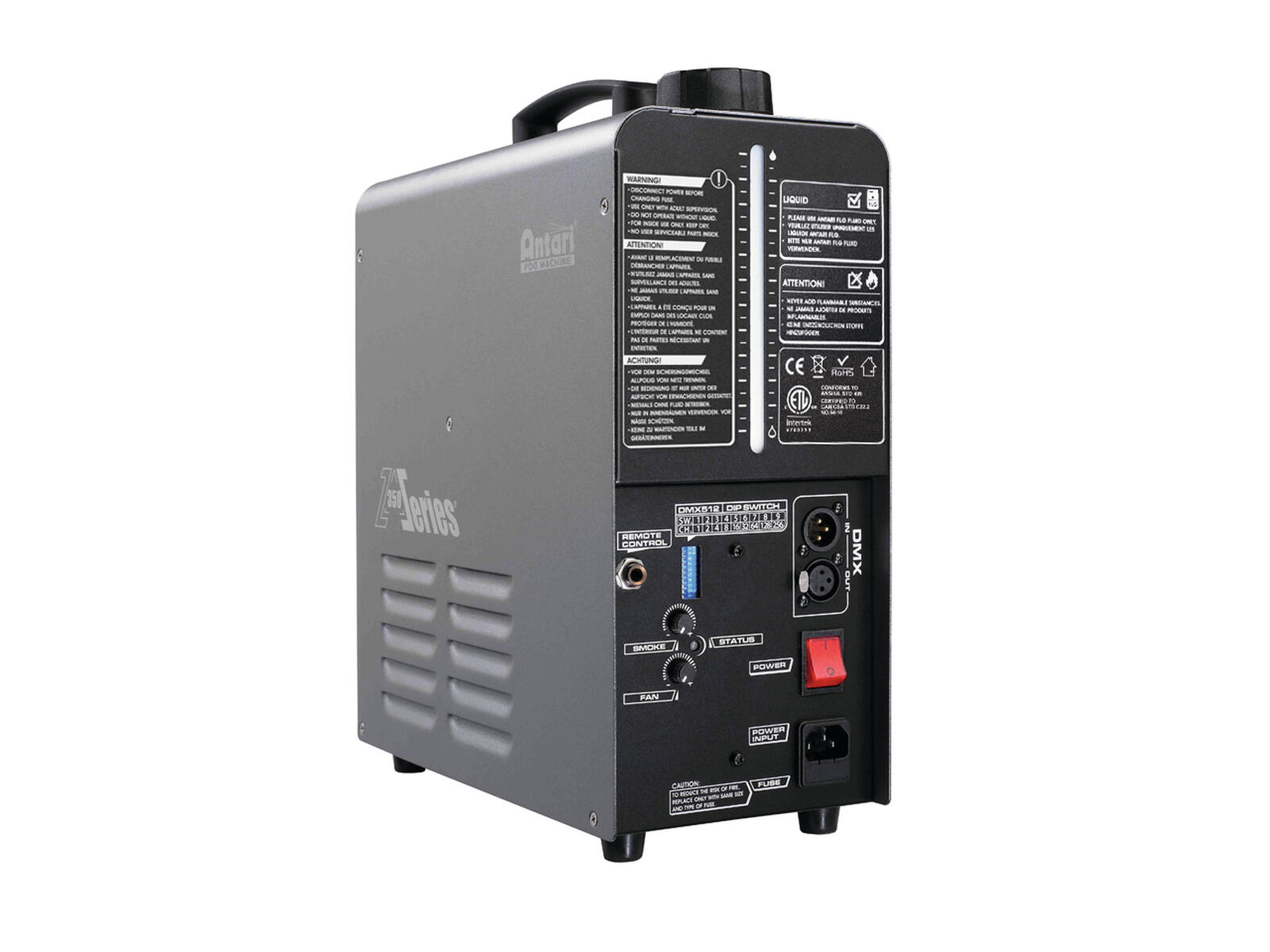 - Intelligent DMX functions: when a DMX signal is received, the unit turns on and starts heating up automatically, when the DMX signal is off, it starts the self-cleaning process and then goes into standby mode
