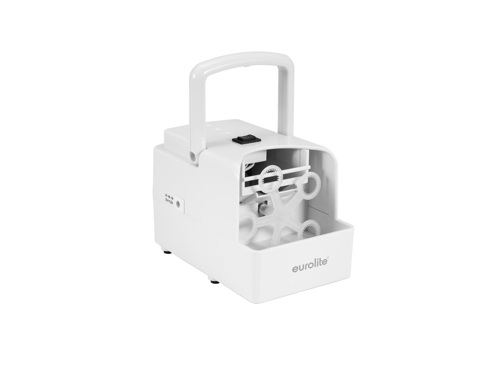 Mini bubble machine with battery operationThe portable mini bubble machine EUROLITE B-20 is especially suitable for spontaneous use at weddings, birthday parties or as a party gag.There are two speed levels to choose from - operation is very easy.The built-in safety function is particularly notable: the wheel stops automatically when there are obstacles and does not start again until two seconds after removal.The EUROLITE B-20 mini bubble machine works with 4 x 1.5 V batteries or a USB power bank. A USB power supply is included.