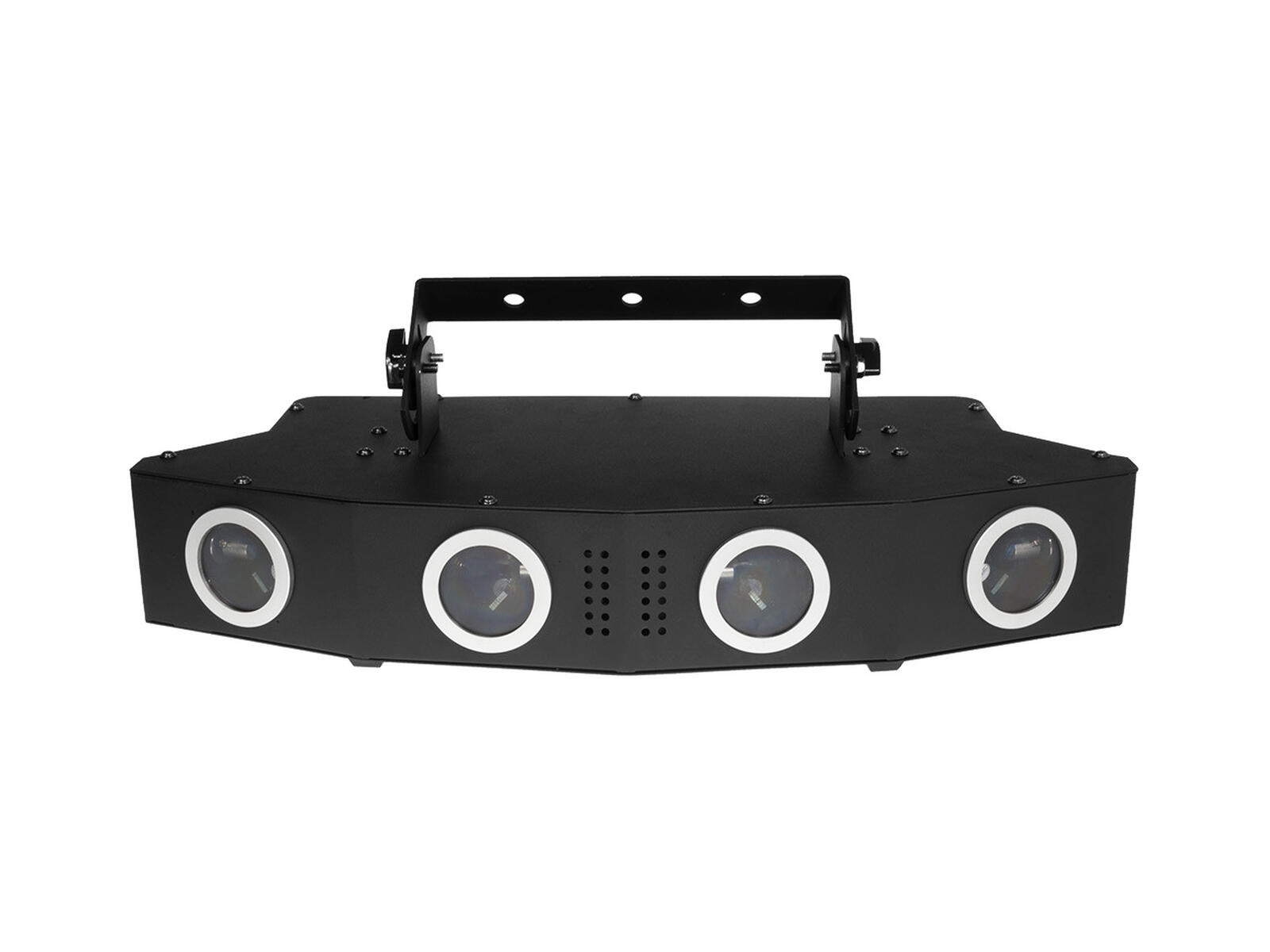The Laserworld EL-900RGB is a complete laser show in one device. It has been designed to especially meet the demands of mobile DJs and smaller nightclubs to fill the whole room and overcome the limits of rather narrow scan angles. The EL-900RGB is an RGB show laser system with a total overall output power of up to 900mW and fast step motors with 3-8 kpps. it has four beam apertures with an individual pair of step motors.Many of the built-in patterns have been programmed in a way that the four laser outlets play well together and fill the whole room, like a multi unit laser show. The curved shape of the unit allows for a very large horizontal deflection angle, so the laser can cover the whole room.The Laserworld EL-900RGB can be run in sound-to-light, stand alone or DMX mode. It can display many different colors, including white!The red diode laser module with a wavelength of 650nm, the green DPSS laser module with a wavelength of 532nm and the royal-blue laser module with a wavelenght of 450nm ensure beautiful colors and bright beams. The beam has 3 mm diameter at aperture and a divergence of about 2 mrad. About 50 preset basic patterns, like layers, tunnels, fences, waves etc. are included. Many of them do not output all the same way on all four laser outlets, but some of the x-axis mirrored or modified in a way, that the laser display looks nice and homogenous. The sensitivity of the integrated microphone can be adjusted for the soud-to-light signal perception.