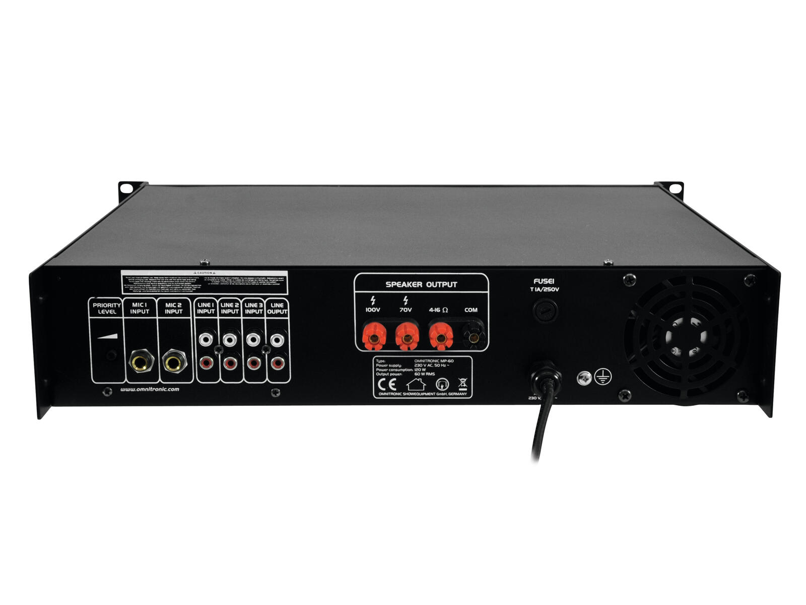High reliability with a maximum of flexibility The Omnitronic MP-60 ELA mixing amplifier is your reliable partner when working with ELA sound systems. Thanks to its 19"" format, it is ideally suited for both mobile and fixed installations. Outputs for ELA loudspeakers with 70 V and 100 V audio transformers or 4-16 ohms loudspeakers leave nothing to be desired. In addition, you can also connect a device with line level (e.g. mixing console) to the line output. With 6 mixable inputs you always stay flexible. Connect up to 3 microphones and 3 line level devices. Announcements are a priorityThe microphone input 3 on the front panel offers an adjustable priority circuit. It enables you to make important announcements with automatic, continuously adjustable level reduction of all signals. Use the gong to additionally point out your announcement. Protective features A fan protects the interior of your MP-60 from overheating. In addition to a switch-on delay, it has overvoltage and short-circuit protection circuits. In these cases, your speakers are electrically isolated from the amplifier. The FAULT LED lights up then and both the MP-60 and your speakers are protected against damage.