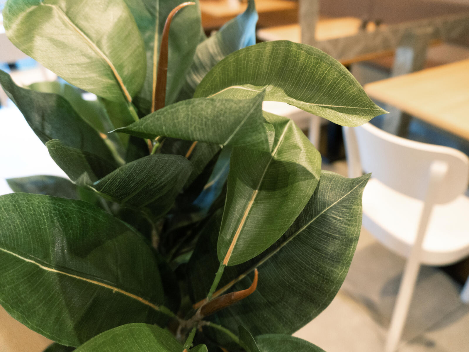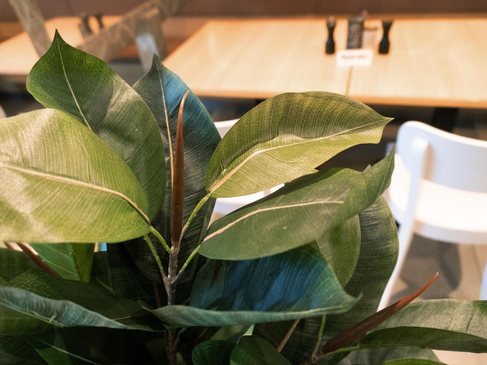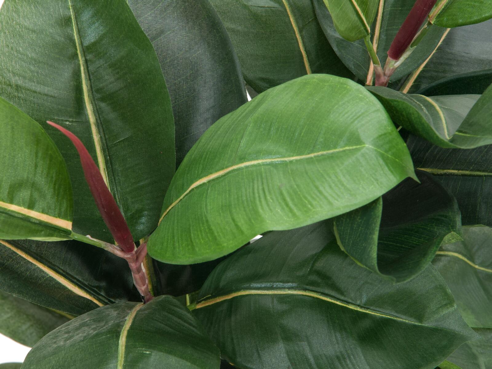 The rubber tree - botanically Ficus elastica - is experiencing its revival as an indoor plant: its elegant growth form combined with large, shiny, wide-oval leaves adds a tropical accent even to soberly furnished offices and living rooms.In contrast to the real rubber tree, this artificial alternative from Europalms does not resent difficult lighting conditions or draughts.During the production of the artificial plant, great importance was attached to natural details, such as the typical reddish petals, which protectively wrap the young leaves of the plant.The artificial rubber tree has a height of 120 cm and is delivered in a black gardeners´ pot, which supports the plant when put in a bigger decorative pot.