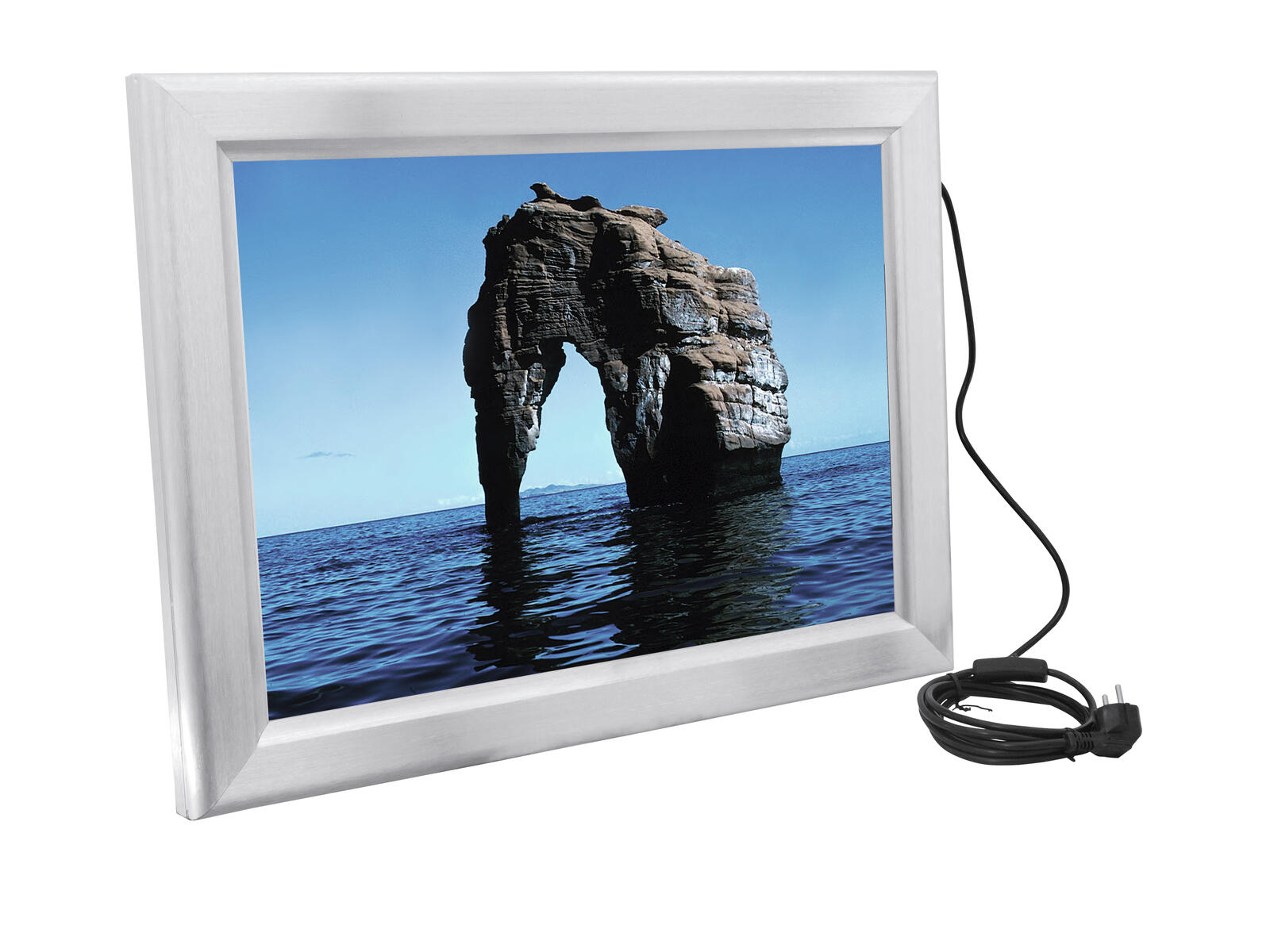 Turn the lights on!Let your posters shine. We can tell you how! Just take a look at our illuminated billboard. With very little effort your posters can be fixed or changed. Simply open the frame, put the poster under the transparent acryl glass panel and shut the frame again. Lights on! Done! The folding frame represents a classic outdoor advertising. But combined with the additional illumination and the precious brushed aluminum frame your posters perfectly come into its own: a perfect presentation in A2 meters. Thanks to the acryl glass panel the important sheets are protected from any impurities and from fading. The frame can easily be mounted to a wall, both upright and horizontal. And as manufacturing is first class, the clips will always close properly, although they have been used numerously. Our illuminated billboard is also available in 1 x 2 m, DIN A3, A1 and A0.